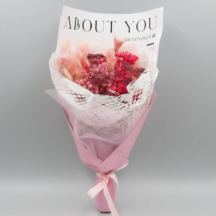Presenting The Pink Bouquet - Dried. This stunning bouquet features perfectly preserved pink Banksia OR roses and gypsophila, accented with a delicate white trim. A medium sized gift, ideal for those who love the color pink. Enjoy a long-lasting floral display without the hassle of maintenance.
