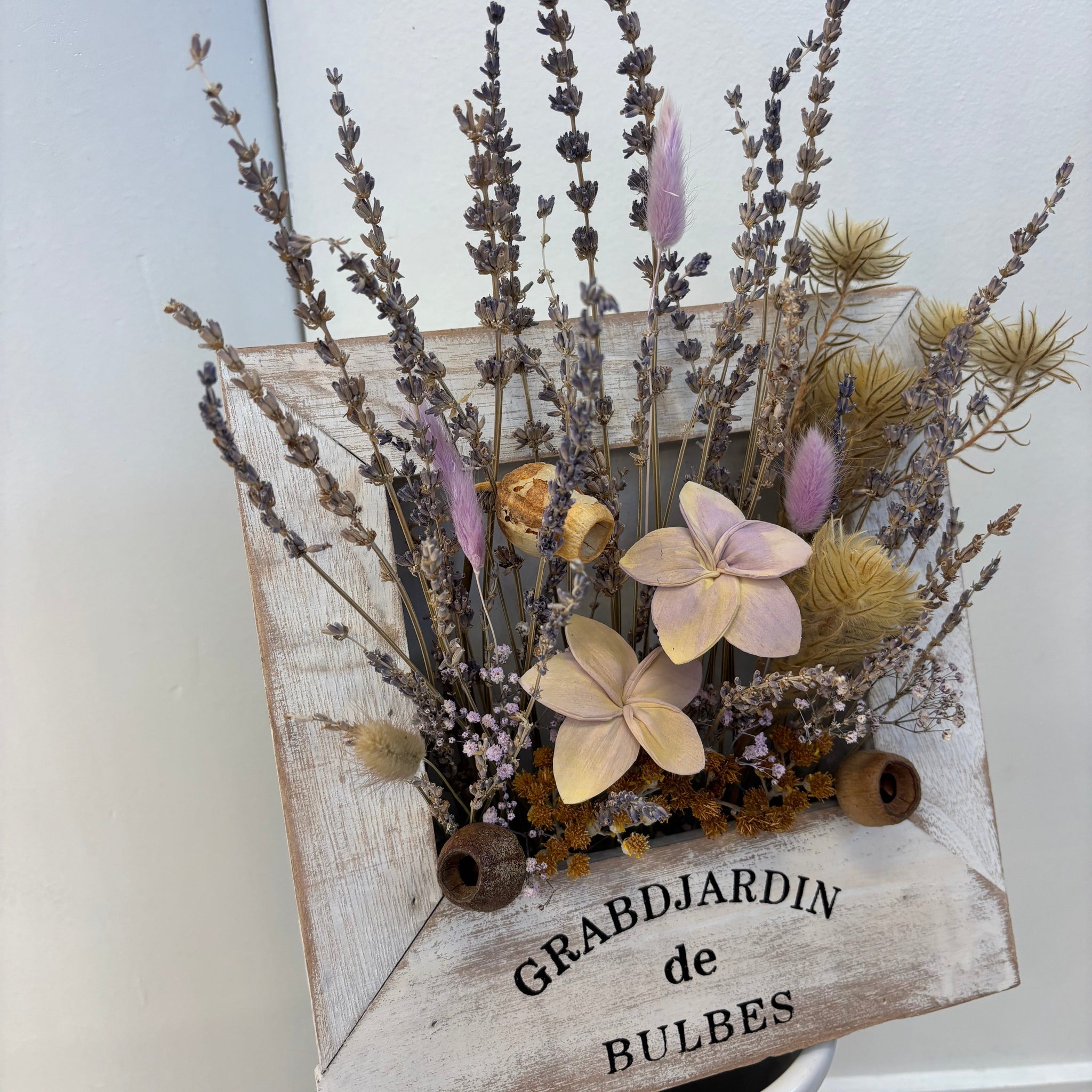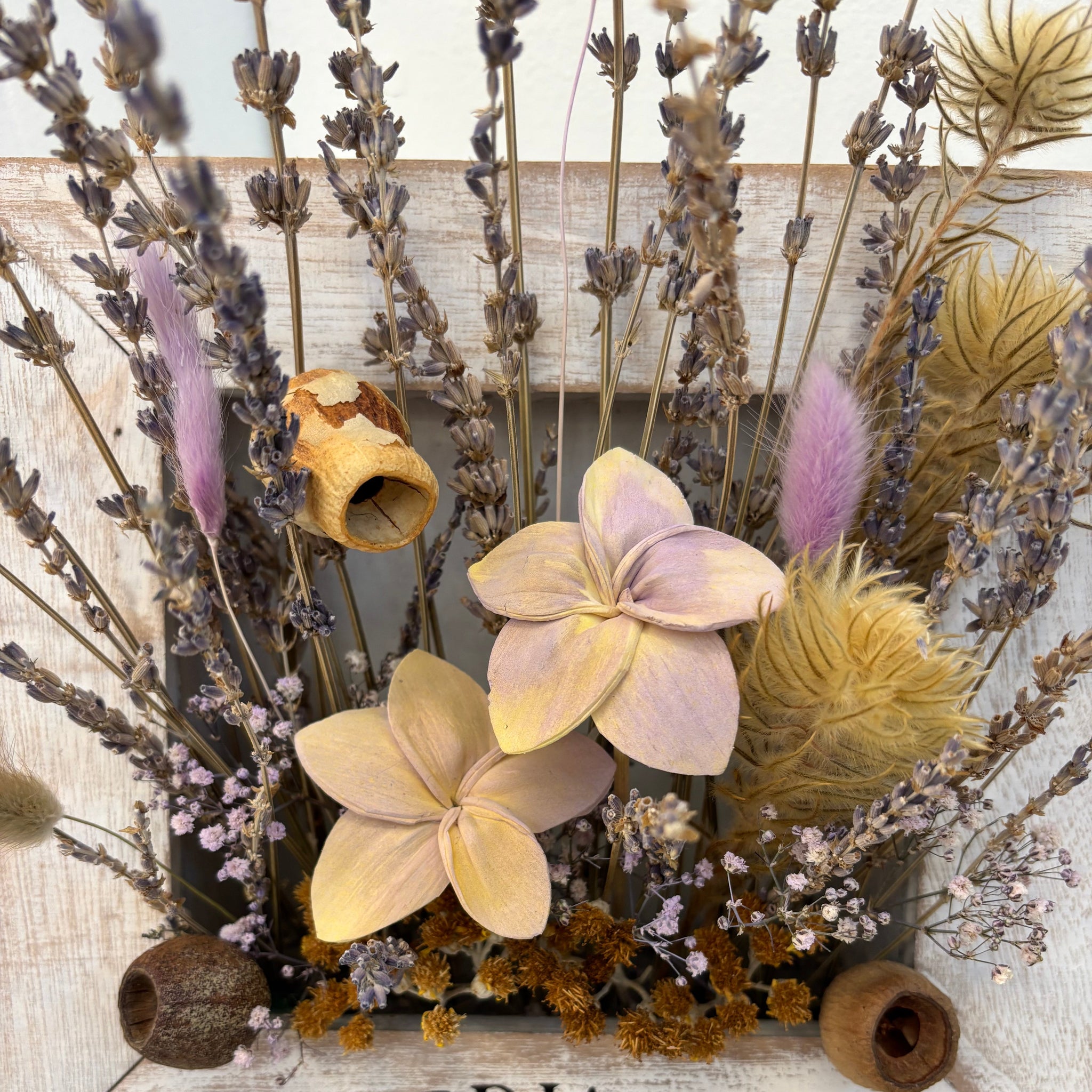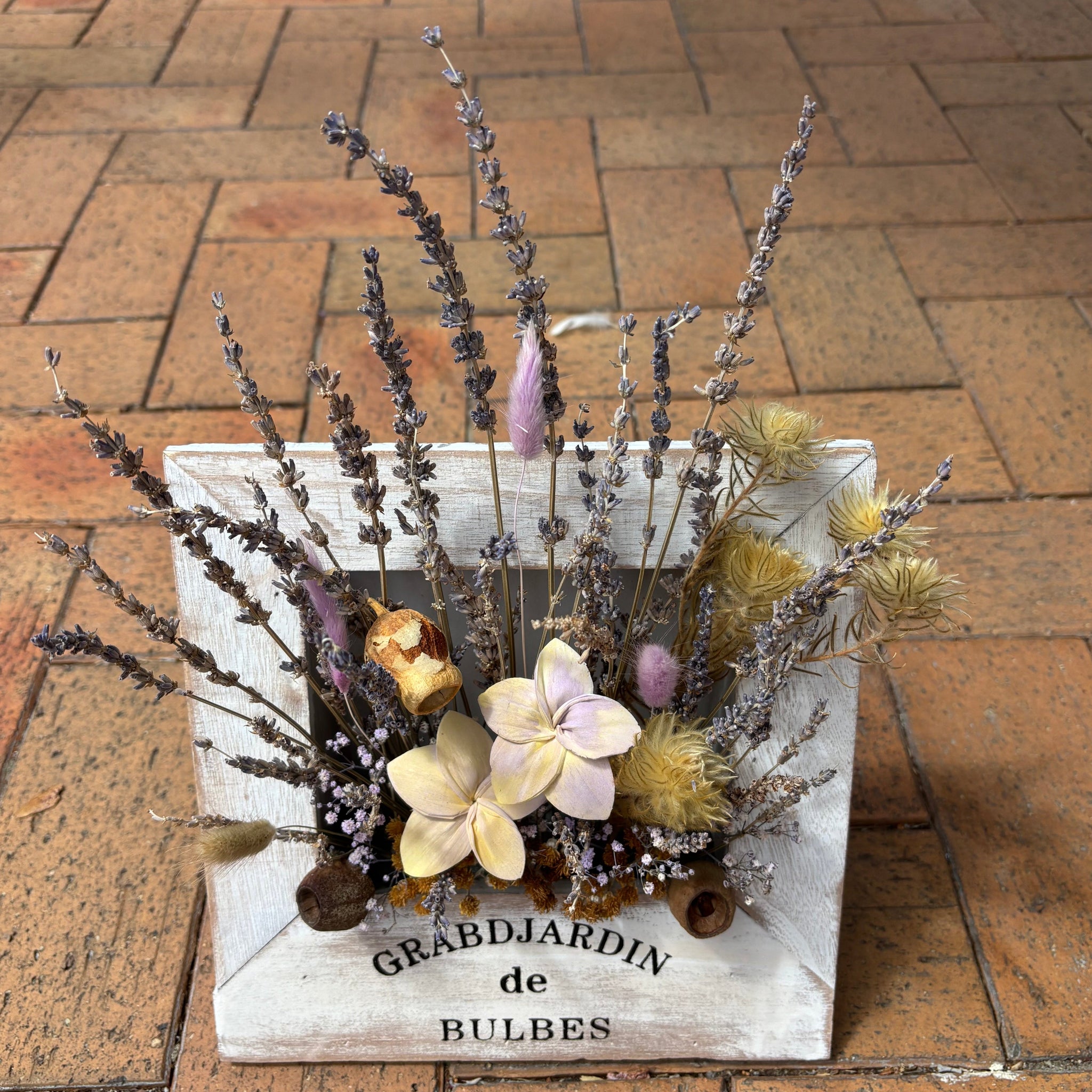 Bring natural elegance into your space with this stunning dried flower arrangement. Featuring lavender, philicas, gum nuts, gypsophila, and delicate sola flowers, each stem is thoughtfully arranged in a rustic wooden flame block. The generous 25cm width and 35cm height create an eye-catching display that complements any room. Perfect as a lasting gift or a timeless addition to your home décor, this arrangement requires no water and maintains its beauty for months.