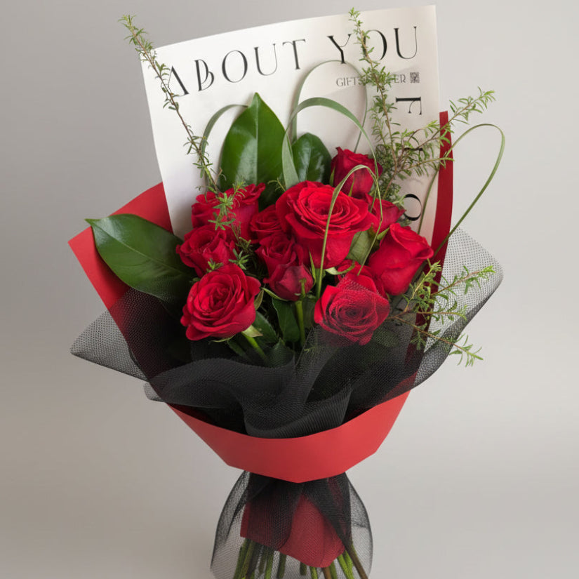 Celebrate love the Kiwi way. Our Kiwiana Romance pairs passionate red roses with native Flax and Manuka foliage for a bouquet that's uniquely yours. Wrapped in our exclusive "About You" paper, it's a playful declaration that says everything without saying a word. Pure romance, pure New Zealand.