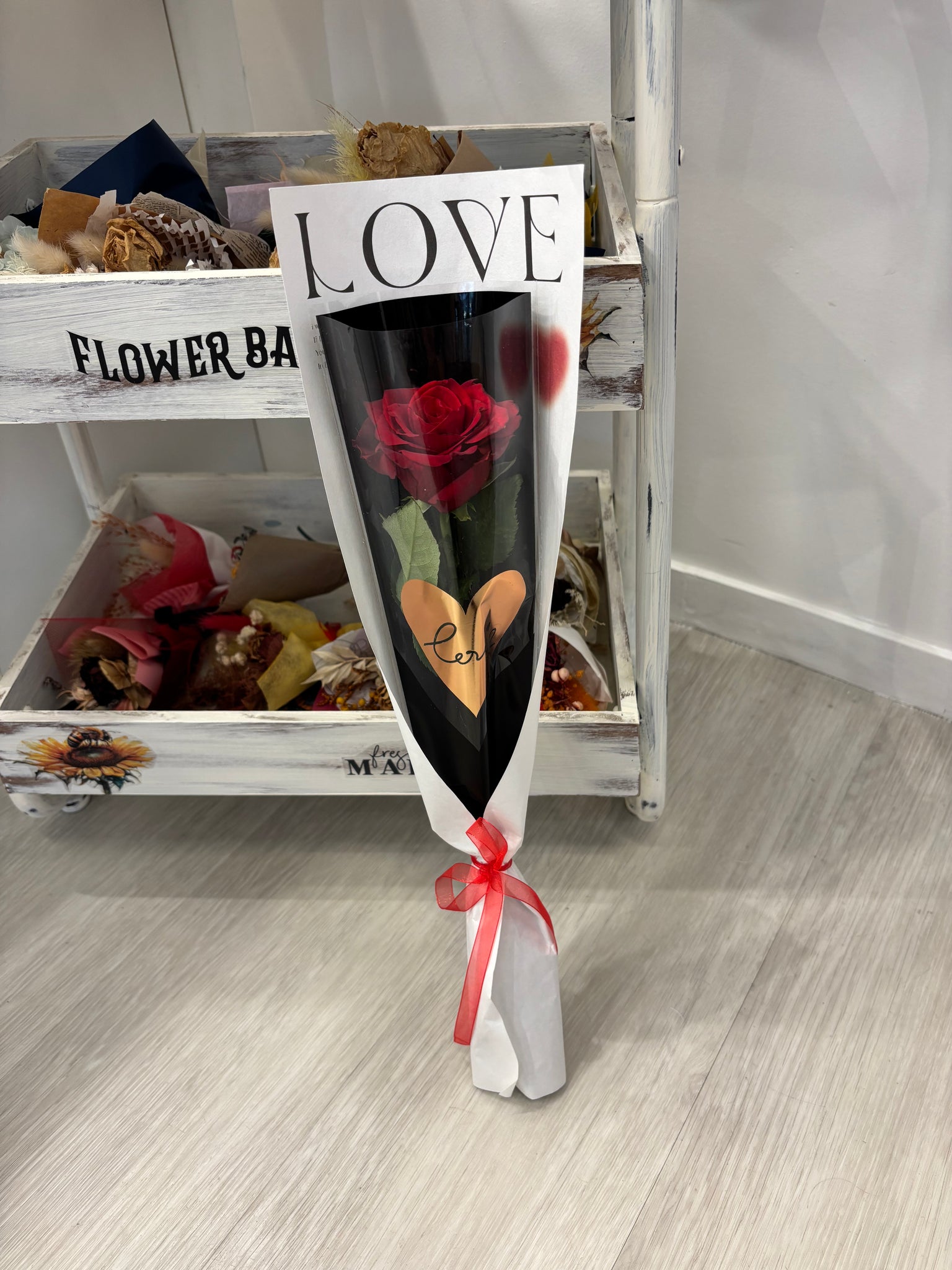 Indulge in the timeless elegance of our single Red Rose, delicately cradled in a 'love' sleeve. This enchanting bloom speaks the language of romance. Perfect for expressing heartfelt emotions, let the deep red hue and delicate fragrance of this rose create a moment that lingers forever. Ideal for anniversaries, declarations of love, or any occasion where love takes center stage.