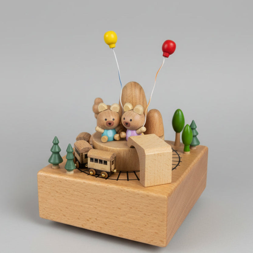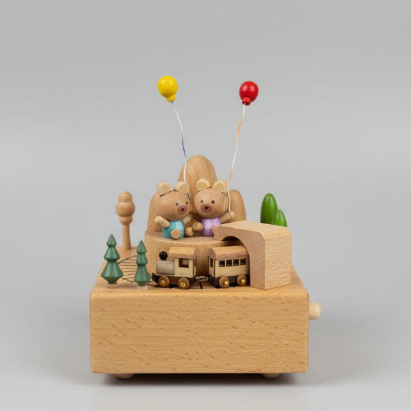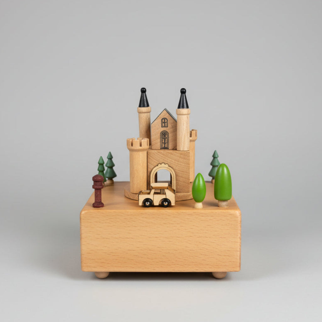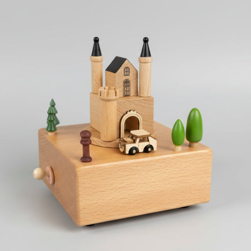 Experience the absolute perfect little gift with our Wooden Music Box. This wind-up box features a magnetic vehicle that glides around the track or rotates the fan/carousel  in the windmill design. Made with high-quality wood, it measures approximately 15cm x 15cm x 15cm. A charming addition to any collection.