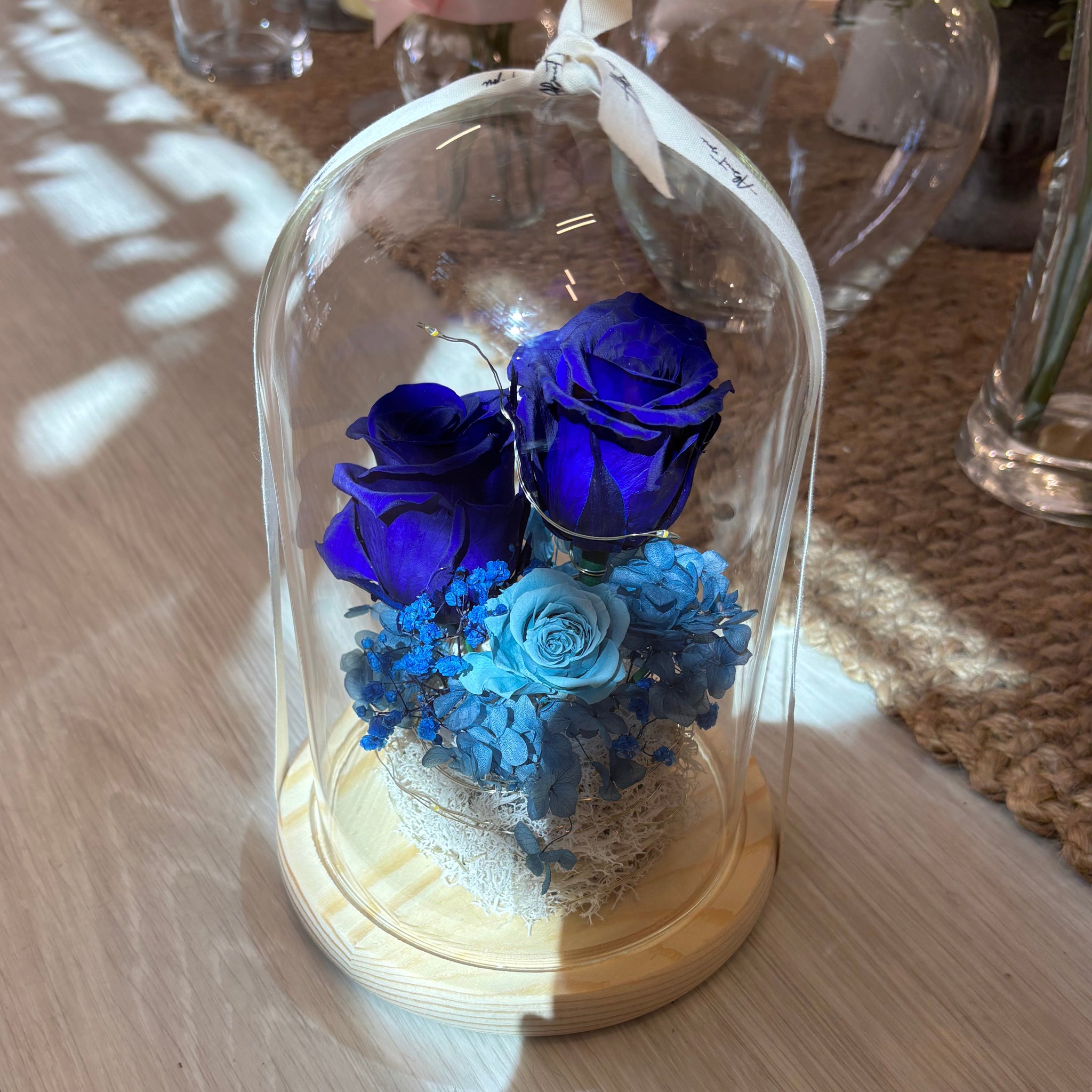 Our Lapis Blue Velvet Dome XL - with seed lights features two extra-large cobalt blue roses and a smaller teal rose, all resting on a soft moss bed. Measuring 15cm by 21cm, this unique piece is illuminated by gentle seed lights for a whimsical glow. Inside, you'll find two stunning pieces of lapis lazuli, known for promoting wisdom and emotional healing.