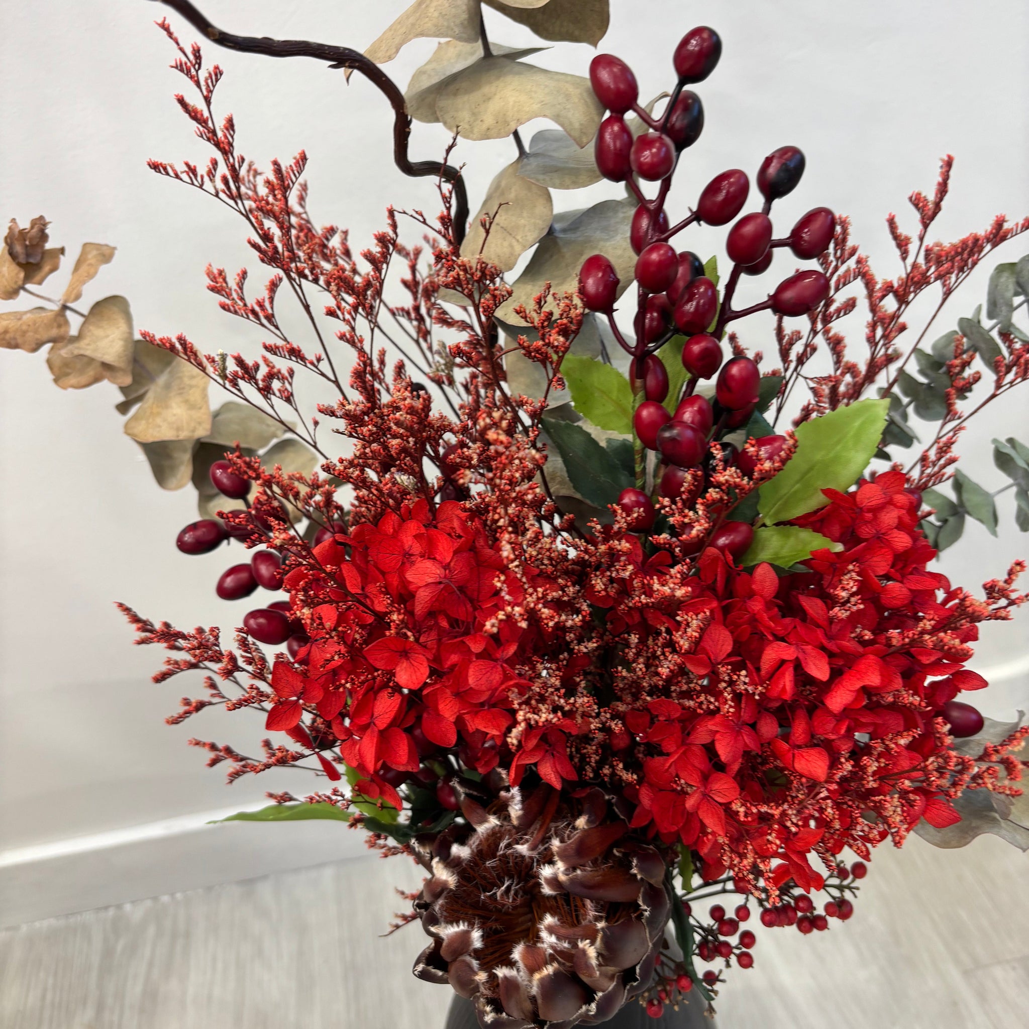 Make a statement with Festive Bloom—a vibrant arrangement that celebrates the season in style. This eye-catching display combines preserved hydrangea, protea, limonium, and playful bunny tails with dried eucalyptus, willow, and pops of festive berries. All arranged in a chic black ceramic vase measuring 60cm tall and 35cm wide, it's the perfect way to add warmth and character to your home without worrying about watering or wilting.