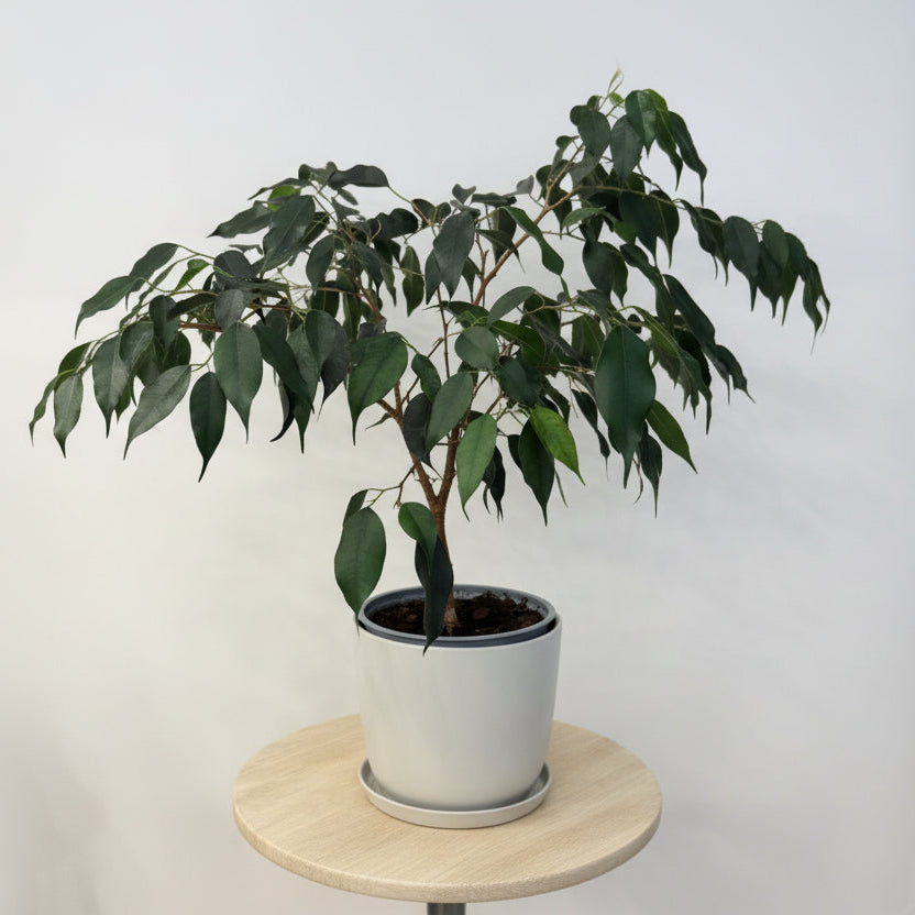 Ficus Danielle (Ficus benjamina 'Danielle') is a popular, compact, bushy variety of weeping fig known for its lush, dark green, glossy leaves and adaptability as an indoor plant or outdoor specimen in warm climates, thriving in bright, indirect light with well-draining, moist soil.  Approx 55cm tall and 75cm wide in a light grey ceramic pot with plate.