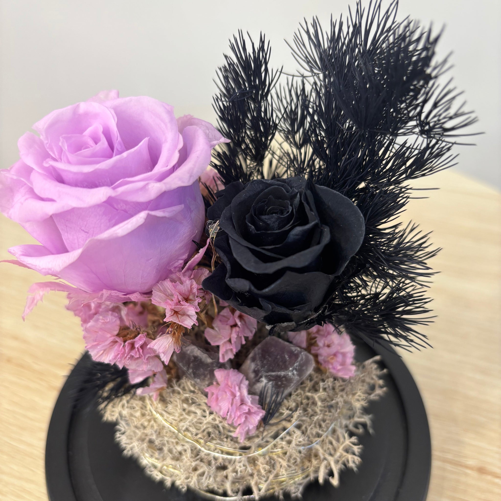 Handcrafted with care, the Garden Violet Dome features a striking combination of a large and a medium ombre rose nestled in a sleek black base. Each dome is lovingly handmade in-store, ensuring your piece is truly unique—just like the one you see in the photo. Perfect for adding a touch of whimsical elegance to any space, this violet-hued rose dome brightens your day with its playful charm and timeless beauty. Whether a gift or a treat for yourself, it’s designed to bring a splash of joy and sophistication wherever it’s displayed.