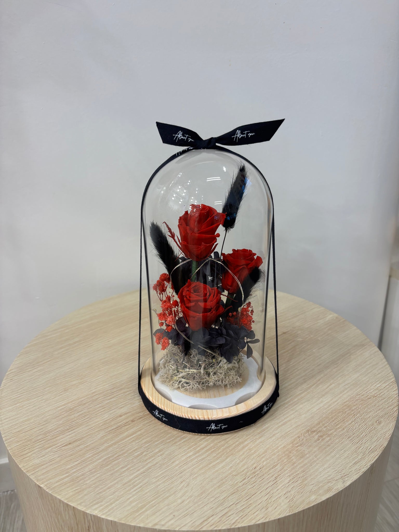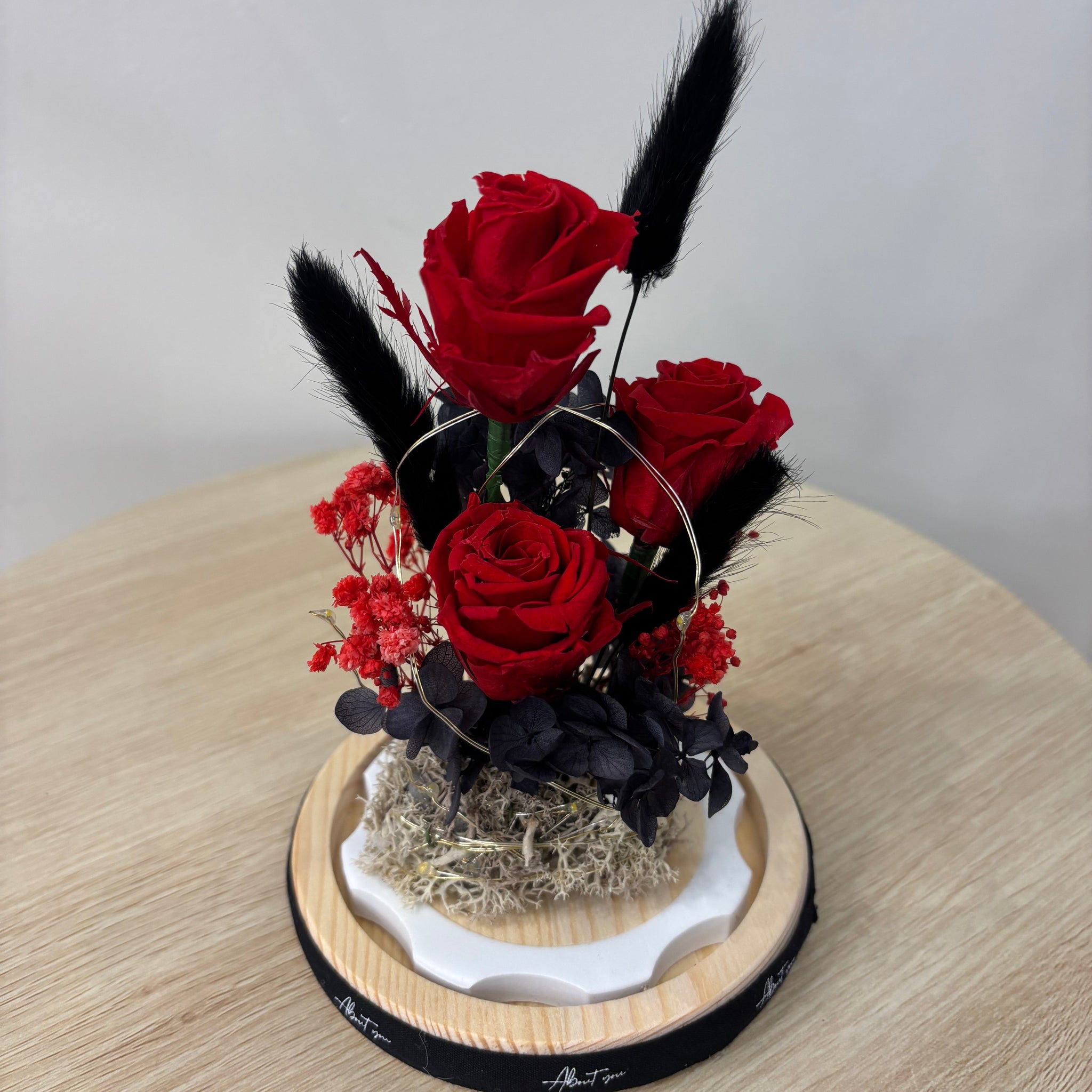 Ruby Love Glass Flower Dome captures timeless romance in a delicate display. Featuring three preserved red roses, black bunny tails, and preserved baby breath and hydrangeas arranged beneath a glass dome, this piece combines natural beauty with lasting elegance. Soft seed lights add a warm glow, perfect for creating an intimate ambiance. Lovingly handmade, each dome is a one-of-a-kind creation.