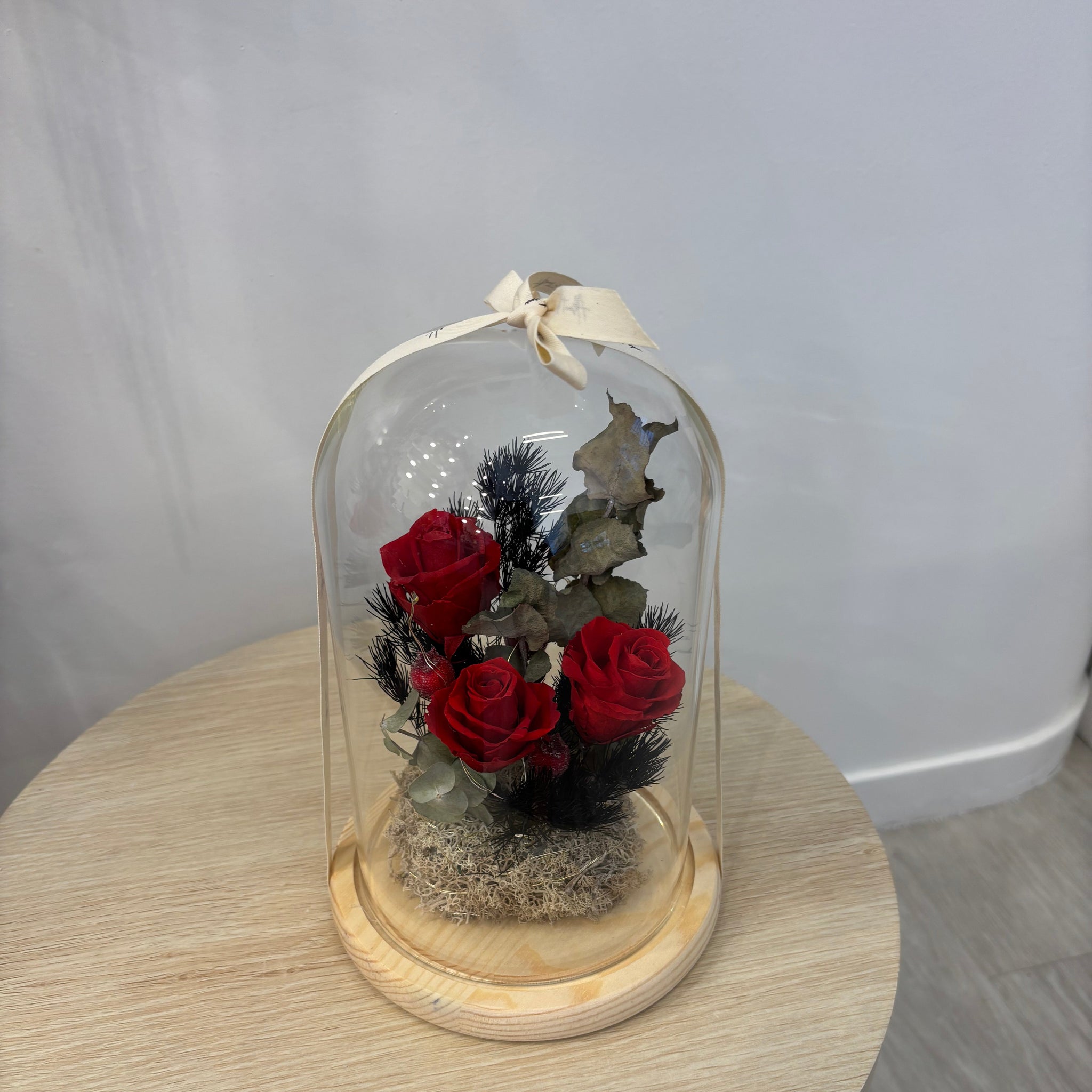 An elegant preserved rose arrangement enclosed in a glass dome, featuring deep red roses complemented by fresh berries, eucalyptus, and ming fern. Handcrafted with meticulous attention to detail, this botanical display is illuminated by a delicate seedlight, creating an understated focal point for any interior. Measuring approximately 23cm in height and 13cm in width, it offers a refined gift that transcends seasonal trends—a lasting tribute to timeless beauty and thoughtful craftsmanship.