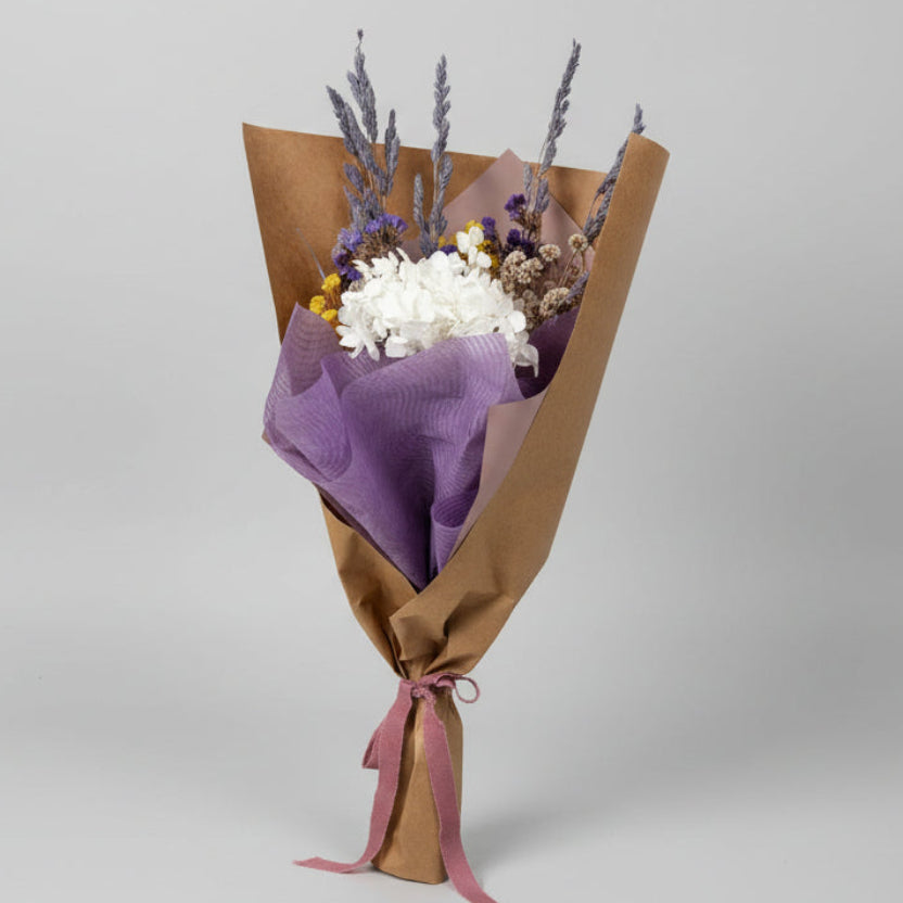 Elevate your space with this curated statice bouquet, where bright yellows, serene blues, and crisp whites converge in harmonious composition. Presented in sustainable kraft paper wrapping, it embodies quiet luxury paired with environmental consciousness. Measuring 40cm in height and 16cm in width, the proportions offer visual presence without excess—ideal for desks, shelves, or entryways seeking understated refinement. These dried blooms retain their sophisticated charm indefinitely, delivering enduring beauty that transcends seasonal trends.